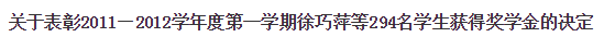 关于表彰2011—2012学年度第一学期徐巧萍等294名学生获得奖学金的决定