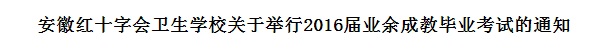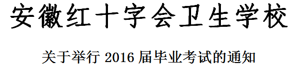 安徽红十字会卫生学校 红卫教字【2015】3号 安徽红十字会卫生学校关于举行2016届业余成教毕业考试的通知 2016届业余成教毕业班全体学生: 根据教学计划安排,2016届业余成教班级(蚌埠医学院成教院13级成教、安徽中医药大学继续教育学院13级成教)各班课程已于11月月底前已全部结束。 为做好2016届各业余成教班级毕业统考等有关工作,保证毕业证书的顺利发放,根据上级教育部门通知精神规定,经学校研究决定:蚌埠医学院成教院13级成教护理、药学各班定于2015年 1…