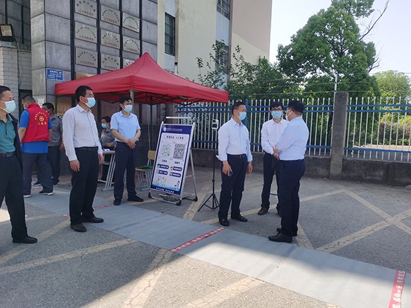 许俊国一行在校门外测温、亮码、登记,了解学校门岗管控情况,随后实地察看了学校校园环境、学校围墙以及核酸检测现场等场地,还向学校负责人仔细询问目前还存在的困难,就进一步做好疫情防控提出意见和建议。方劲松从疫情防控的各项工作及校园基础建设等方面作工作汇报。