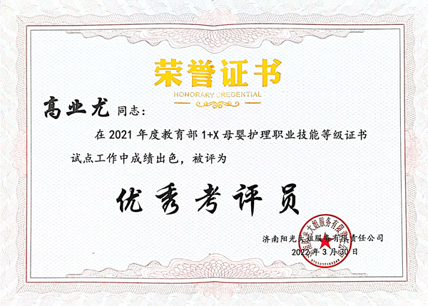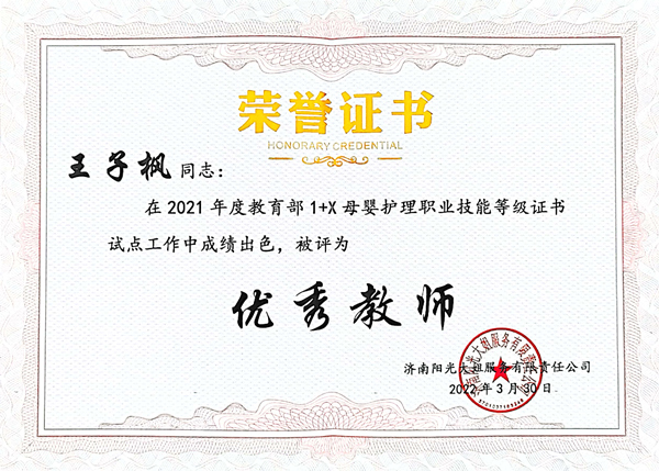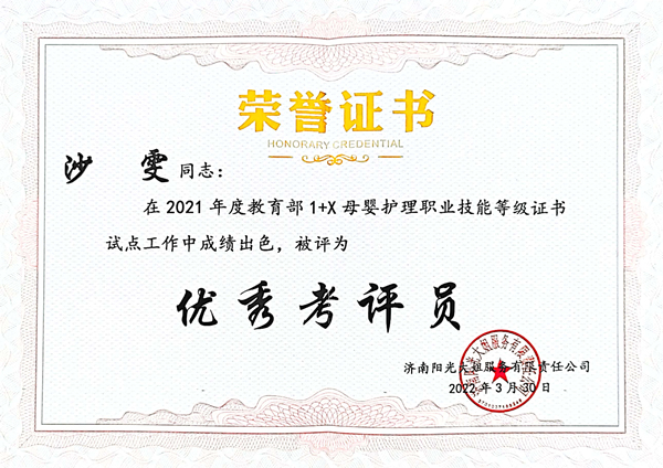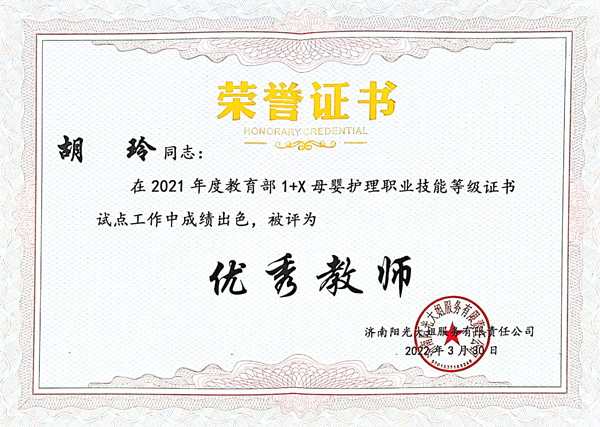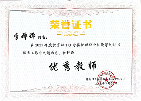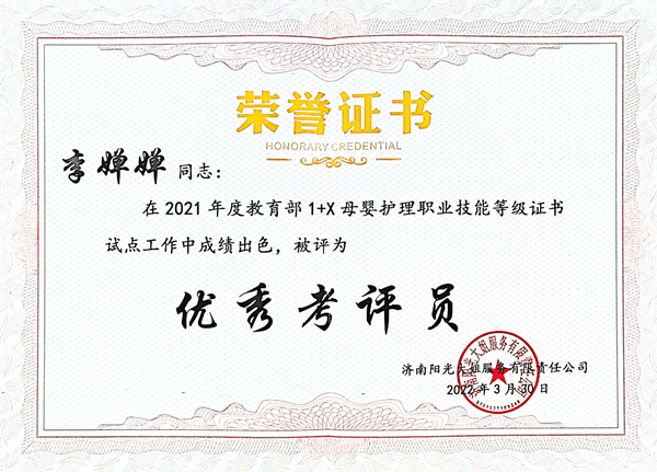 近日,我校被教育部培训评价组织单位授予“2021年度‘1+X’母婴护理职业技能等级证书‘优秀试点院校’”荣誉称号,李婵婵、胡玲、王子枫3名教师被评为“优秀教师”,沙雯、李婵婵、高业尤3名教师被评为“优秀考评员”。