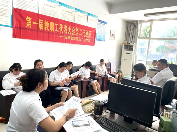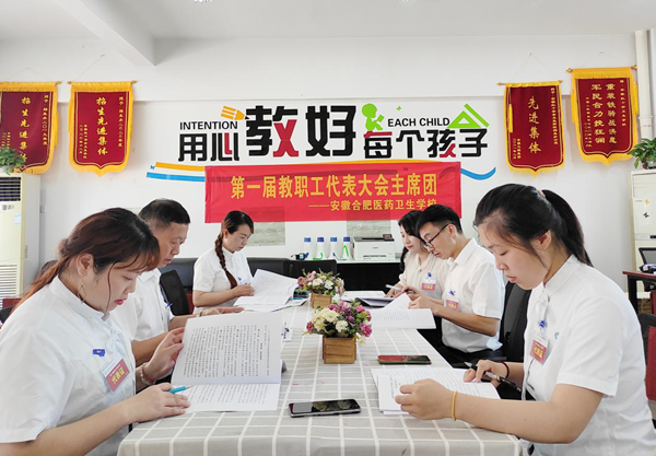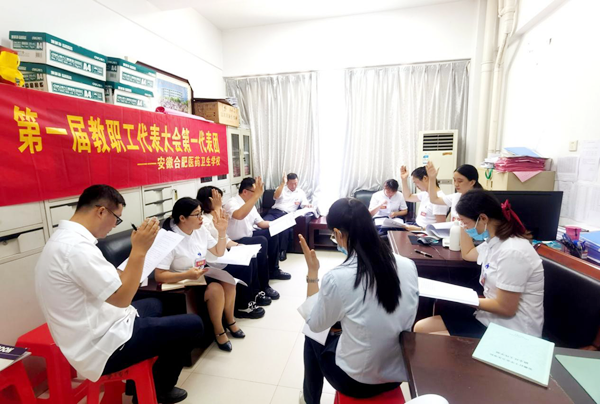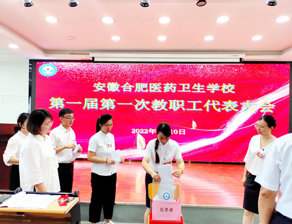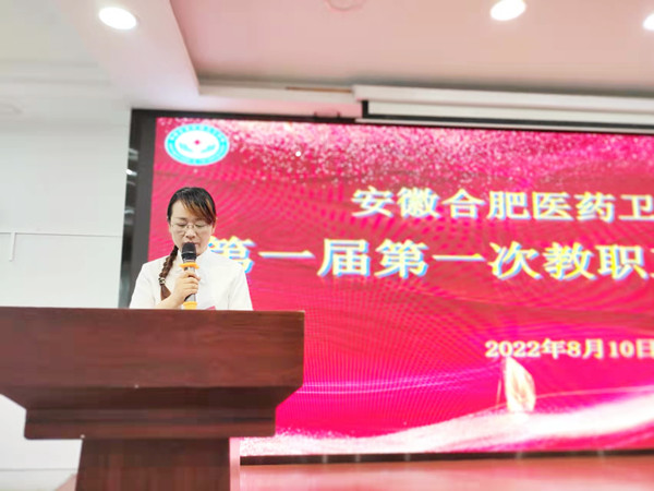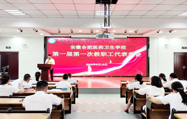 为进一步推进学校民主建设,加强民主管理,8月10日,安徽合肥医药卫生学校第一届第一次教职工代表大会在教学楼多功能厅召开。校领导方劲松、洪梅、胡军健、徐晶晶出席大会。全体正式代表和特邀代表等参加了此次会议。会议分为两个阶段,第一阶段由校长助理徐晶晶主持,第二阶段由副校长胡军健主持。