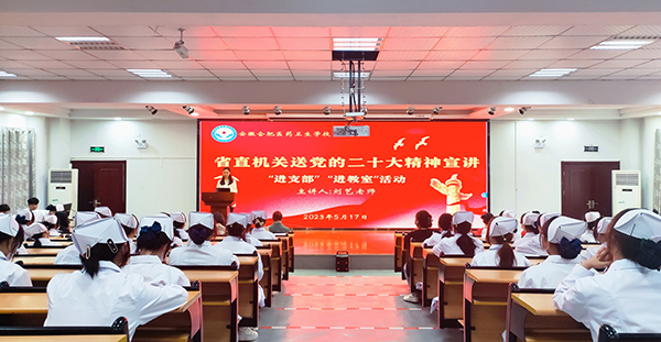 为深入学习宣传贯彻党的二十大精神,大力弘扬劳模精神、劳动精神、工匠精神,在安徽医药卫校2023年职教周活动如火如荼进行之际,安徽省直机关工委宣讲团来校开展党的二十大精神进支部、进教室宣讲活动。此次宣讲活动由省直机关工委讲师团成员刘艺老师进行宣讲,宣讲活动由校团委书记吴晓杰主持。