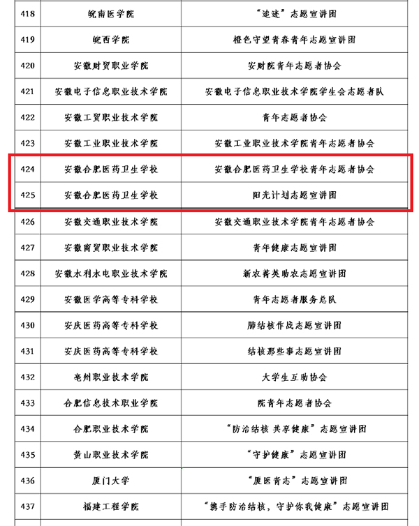 近日,国家疾病预防控制局传染病防控司、团中央青年志愿者行动指导中心联合发布2023年全国大学生“防治结核 志愿有我”志愿宣讲团入选团队名单,安徽合肥医药卫生学校“青年志愿者协会”和“阳光计划志愿宣讲团”两支宣讲团队成功入选。