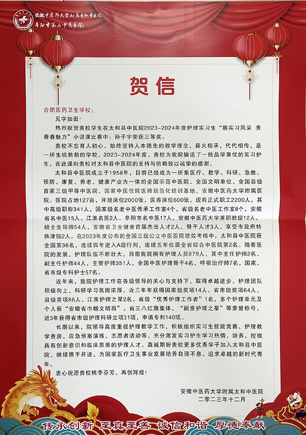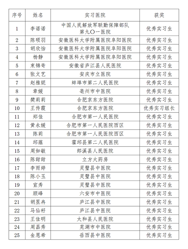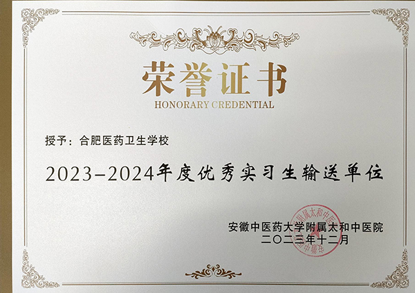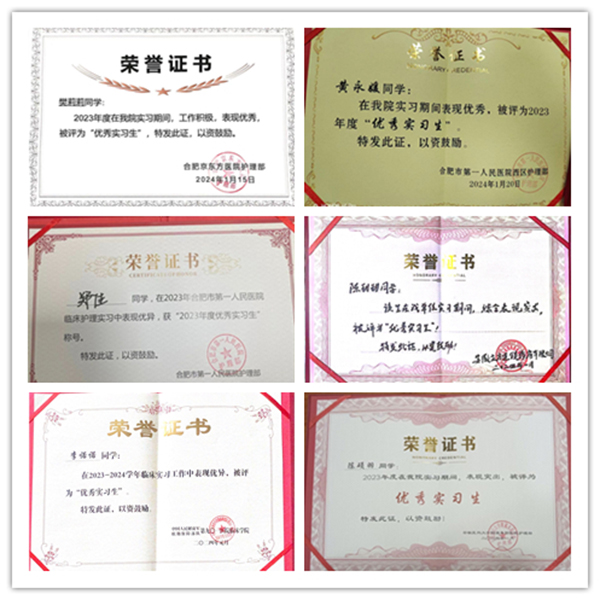 近日,我校多个合作实习单位传来喜讯,截至目前,学校已有25名实习学生分别被中国人民解放军联勤保障部队第九〇一医院、安徽医科大学附属医院阜阳医院、合肥市第一人民医院、合肥京东方医院、庐江县人民医院等实习单位评为“优秀实习生”和“优秀实习组长”,学校也被安徽中医药大学附属太和中医院授予“优秀实习生输送单位”荣誉称号。