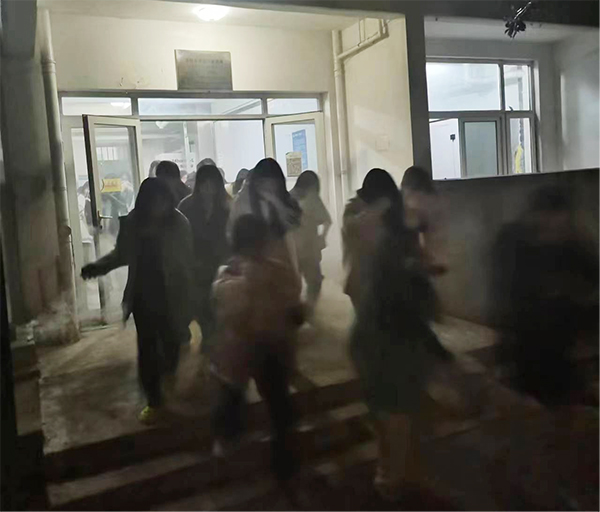 晚上九时许,一阵一阵的紧急哨声、弥漫的烟雾分别在学生一号宿舍楼响起、环绕。“着火啦,着火啦”,同学们大声的呼喊着,“同学们,不要慌张,捂好口鼻,弯腰低头,迅速有序撤离”,楼梯的引导老师在紧急疏散学生。在老师的指挥下,全体同学按照预定疏散路线迅速撤离宿舍楼,到达指定位置集合。