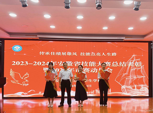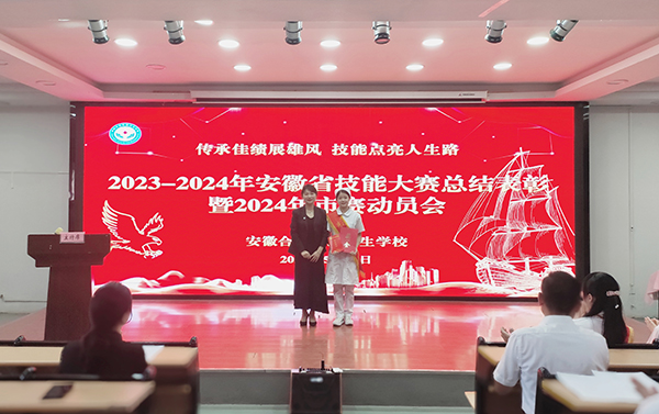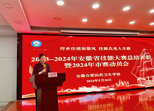 活动在庄严的国歌声中拉开帷幕,会议宣读了《安徽合肥医药卫生学校关于表彰2023年全省中职学校技能大赛获奖学生和指导教师的决定》文件。校领导分别为2023年省赛获奖学生、指导教师颁奖。2023年省赛优秀指导教师代表、省赛获奖学生代表,2024年市赛指导教师代表,2024年市赛参赛学生代表,依次做了交流发言。