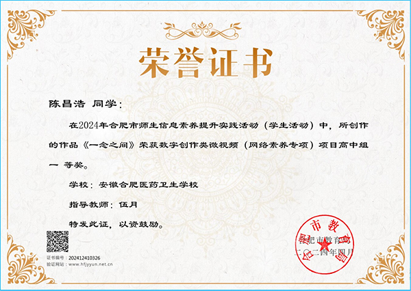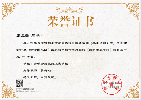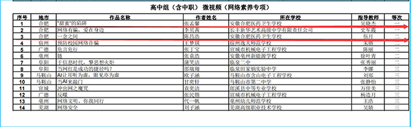 近日,安徽合肥医药卫生学校选送的微视频(网络素养专项)作品《“甜蜜”的陷阱》《一念之间》分别荣获第二十二届安徽省学生信息素养提升实践活动(学生组)数字创作类一等奖、二等奖,其中《一念之间》将代表安徽省参加全国师生信息素养提升实践活动(第二十五届学生活动),并进行现场交流展示。
