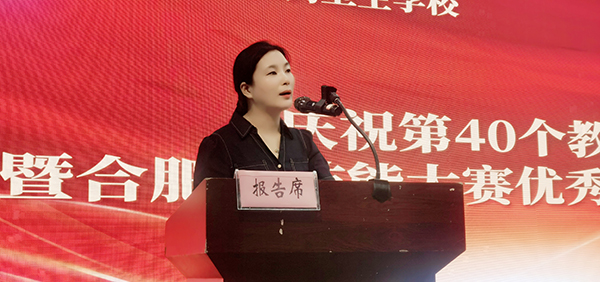 王学梅老师作为教师代表发言。她讲述了作为一名教师的工作感受,对学校提供的发展平台表示由衷的感谢。她表示,在今后的教育教学工作中,将继续涵养高尚师德师风,不断提升教书育人能力,落实立德树人根本任务,为社会培养更多高质量专业技能人才,为推动学校发展再上新台阶做出应有的贡献。
