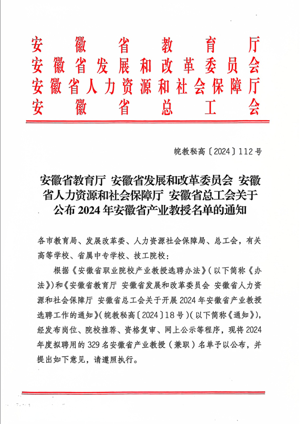 近日,安徽省教育厅、省发改委、省人社厅和省总工会等四部门联合发文,公布了2024年安徽省产业教授(兼职)名单。安徽合肥医药卫生学校从校企合作单位推选出的安徽三联机器人科技有限公司总经理、高级经济师梅珑,安徽医科大学第一附属医院东城院区院长、主任医师张勇,安徽医科大学第一附属医院东城院区副院长、副主任医师张修稳,中国科学技术大学附属第一医院护士长、副主任护师陈彦等4名企业(医院)兼职导师成功获批为2024年安徽省中职院校产业教授。本次全省中职院校共获批28名产业教授,安徽医药卫校推荐的4名产业教授全部入选。