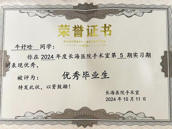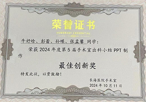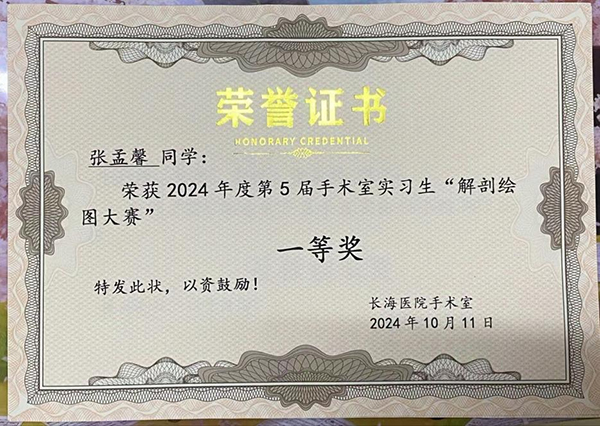 在上海长海医院,安徽医药卫校护理专业实习生牛妤晗、彭蕾、孙蝶、张孟馨在该院举办的2024年度第5届手术室出科小结PPT制作比赛中表现优秀,荣获团队最佳创新奖;张孟馨在该院举办的2024年度第5届手术室实习生解剖绘图大赛中,荣获一等奖;牛妤晗在该院2024年度手术室第5期实习期间表现良好,勤劳肯学,积极上进,被评为“优秀毕业生”。
