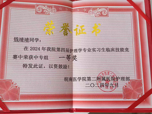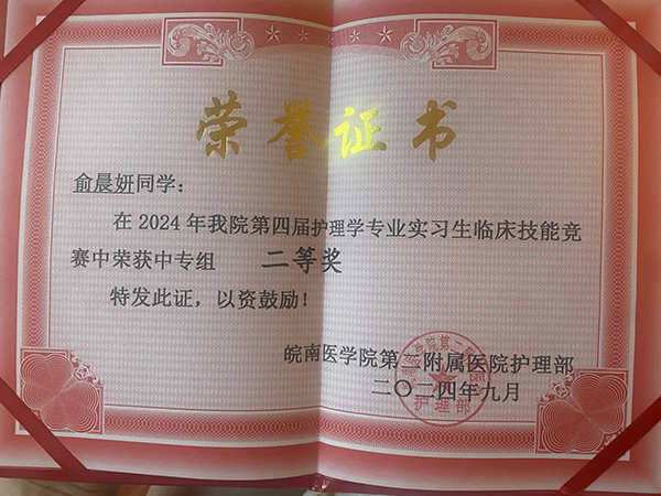 在皖南医学院第二附属医院,安徽医药卫校护理专业实习生钱靖靖、俞晨妍凭借扎实的护理专业技能,在该院举办的第四届护理学专业实习生临床技能竞赛中分别荣获一、二等奖。