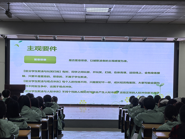 此次活动特邀请国家职业学校老师、高级讲师张艳进行防欺凌宣讲。张老师就校园欺凌的定义和类型向同学们进行详细介绍,并结合经典案例,深入浅出地讲解法律知识,讲述了校园欺凌的严重危害及需要承担的法律责任。通过宣讲引导同学们要自觉遵法、学法、守法、用法,告诉同学们在遭遇校园欺凌时,要保持冷静勇敢,保留证据及时向家长、老师或学校管理人员上报,并寻求法律的帮助和支持。