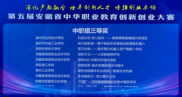 12月17日,第五届安徽省中华职业教育创新创业大赛决赛及颁奖大会在阜阳职业技术学院举行。安徽合肥医药卫生学校首次参加该赛事,从校赛到省赛,最终凭借项目《竹眠--还您健康睡眠的天然中医药手环》荣获省赛三等奖(中职组),实现了突破。