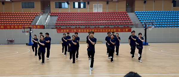 本次大赛汇聚全县各校精英队伍,赛场上武姿飒爽,竞技氛围热烈非凡。安徽医药卫校武术健儿们精神饱满、气宇轩昂,整套动作行云流水、刚柔并济,将武术的力量之美与韵律之美完美融合。一招一式间,不仅展现出体育健儿昂扬向上的精神风貌,为现场观众和评委呈现了一场精彩的武术盛宴,更生动诠释了中国武术的独特人文魅力。