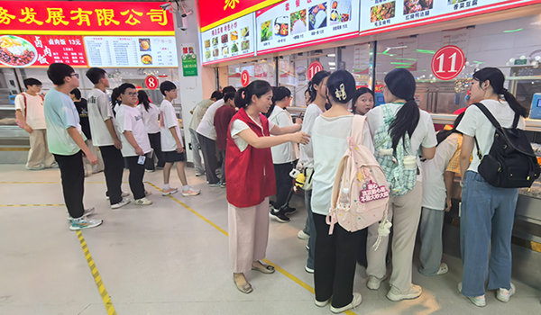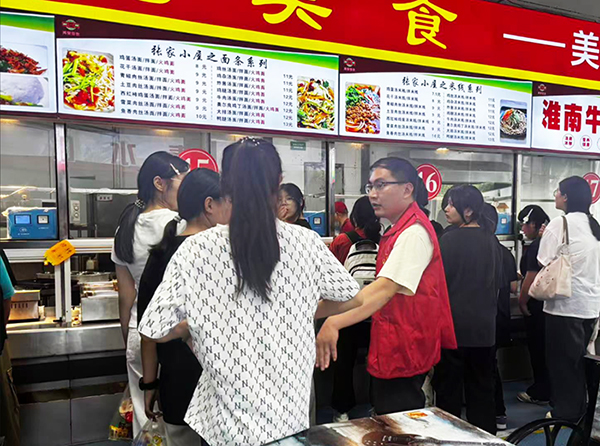 食堂内,志愿者们分组维持排队秩序,引导餐后回收餐具,开展就餐满意度调查,提醒同学们注意食品卫生、均衡膳食,帮助新生培养文明就餐习惯,热情耐心答疑解惑,以实际行动守护校园食品安全,身着的“红马甲”成了就餐期间一道亮丽的风景线。
