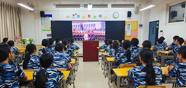 上午9时,中共中央总书记、国家主席、中央军委主席习近平发表重要讲话并检阅部队,全体师生聚精会神、认真聆听,共同目睹受阅部队的威武雄姿。当仪仗方队昂首阔步通过检阅台,当抗战老兵代表以坚毅姿态致敬历史,当各类新型武器装备展现国家国防实力时,师生们深刻感受到80年前中国人民浴血奋战、抵御外侮的悲壮历程,更直观体会到如今国家繁荣富强、民族复兴的坚实步伐。