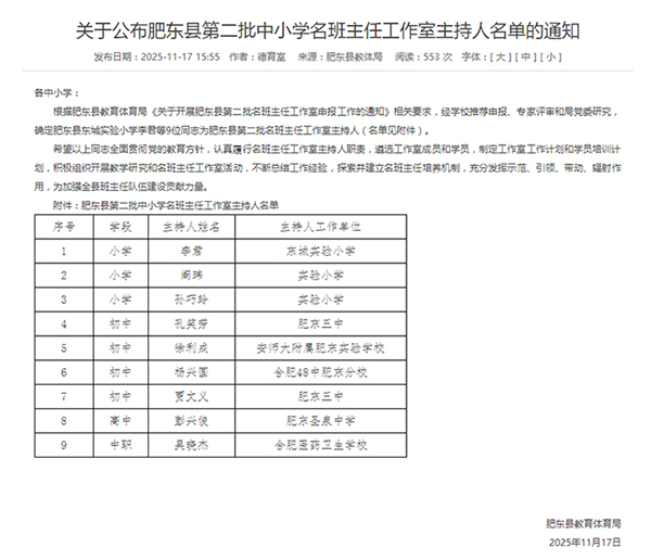近日,肥东县教育体育局正式公布了第二批中小学名班主任工作室主持人名单。经过层层选拔与严格评审,安徽合肥医药卫生学校吴晓杰老师成功入选,并成为本批次中职学段唯一获此殊荣的教师代表,展现了学校班主任队伍建设的扎实成果与育人风采。