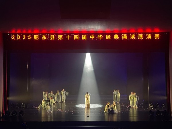 作为肥东县持续14年的文化品牌活动,本届经典诵读以“典耀中华·诗润东城”为主题,强调传统文化与现代审美的深度融合。安徽合肥医药卫生学校参赛作品《渔家傲·天接云涛连晓雾》突破传统诵读模式,将舞蹈、情景表演与诗词意境结合,学子们身着汉服,以清越之声诵读“学诗谩有惊人句”,又以激昂语调诠释“直下看山河”的壮志,在传统与现代的碰撞中传递出“乘风好去”的青春力量。