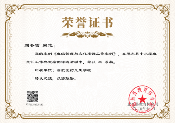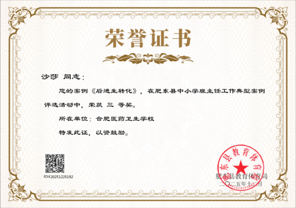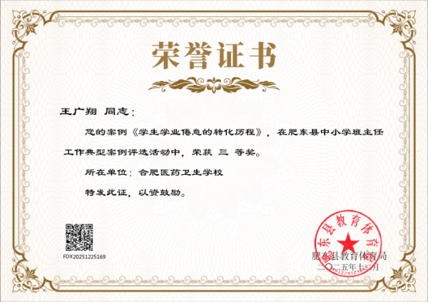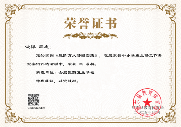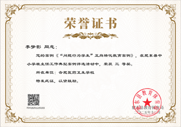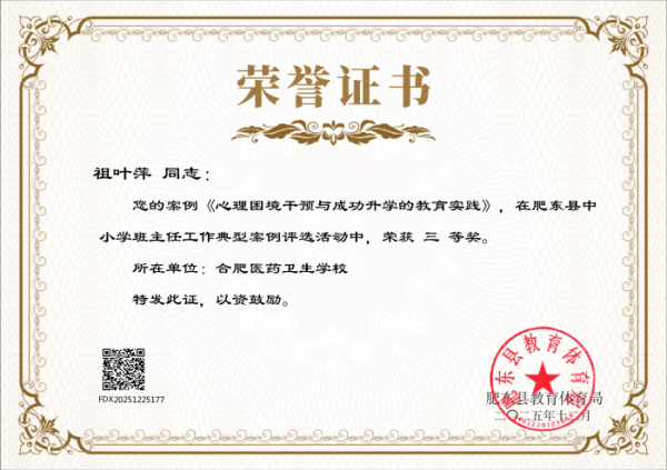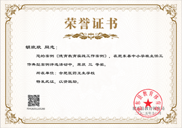 近日,肥东县教育体育局发布《关于公布肥东县中小学班主任工作典型案例评选结果的通知》,安徽合肥医药卫生学校多名班主任凭借扎实的育人实践、创新的管理方法和深刻的教育思考,在此次评选中脱颖而出,喜获多项荣誉,充分展现了学校班主任队伍过硬的专业素养和良好的育人风貌,为学校赢得了荣誉。