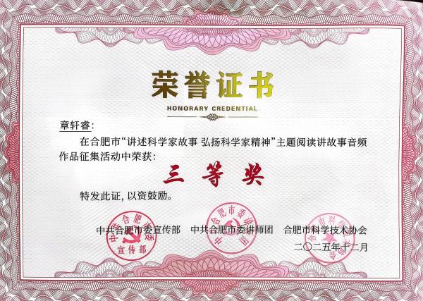 近日,由中共合肥市委宣传部、市委讲师团、市科学技术协会联合主办的“讲述科学家故事 弘扬科学家精神”主题阅读讲故事音频作品征集活动圆满落幕。安徽合肥医药卫生学校护理专业学生章轩睿的作品《白衣为甲 信仰为炬》获得三等奖。该作品以钟南山院士的事迹为主线,通过朴实真诚的叙述,呈现其奉献精神和专业追求。章轩睿在讲述中结合自身医护专业的理解,将科学精神与医学使命相联系,获得了评委与听众的肯定。