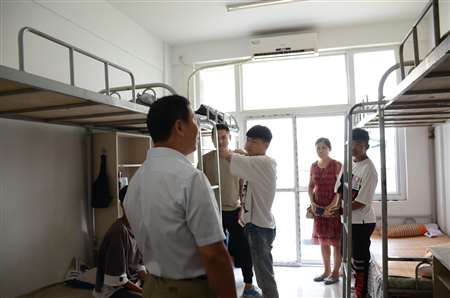 在宿舍热水智能设备前,校领导方劲松、洪梅亲自查看热水设备,并亲自体验,感受高科技给生活带来的便捷。每到一个宿舍,领导们都细心查看宿舍设施,与新生和家长们亲切交流,详细询问他们到校后的感受,了解他们的生活状况,并且强调有困难一定要及时向班主任或生活老师(宿管)反映,学校一定会尽力帮助解决。并叮嘱同学们做好防蚊、防盗、用电安全工作,关切地嘱咐新生们要多与同学相互交流,尽快适应新环境,要好好休息,注意身体。