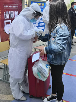 4月26日早上,学校疫情防控工作领导小组全体成员及各班主任、校医、后勤工作人员全部到位,为返校学生提供最贴心的服务。学校返校时都佩戴口罩,保持1米间距,手持家长和本人签字的承诺书排队入校,经入学检查工作人员查验“安康码”、核对身份、测量体温等流程后进入校园。在入校检测点,我们的老师为返校学生指引规定的行走线路、帮助学生搬运行李、为行李消毒杀菌等。