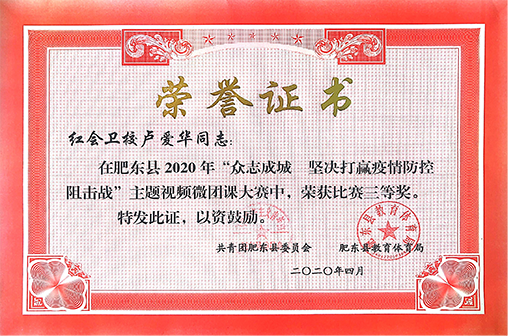 在刚刚揭晓的肥东县2020年“众志成城,坚决打赢疫情防控阻击战”主题视频微团课大赛中,我校徐晶晶老师和卢爱华老师分别凭借精心设计的微团课《比心武汉——疫情当前,红卫人对武汉的告白》和《“宅家”即“战斗”,疫情防控靠大家》取得优异成绩,分别荣获二等奖和三等奖。
