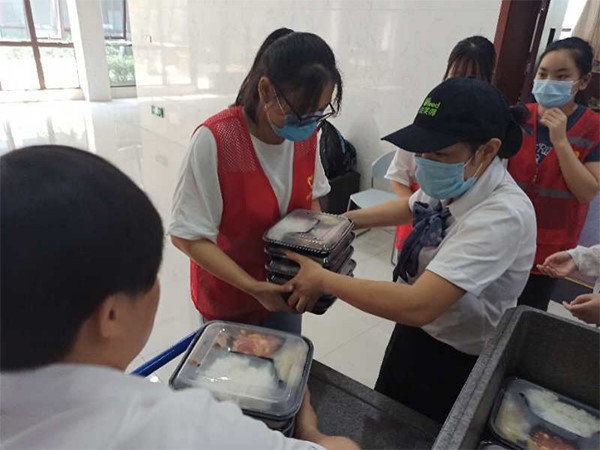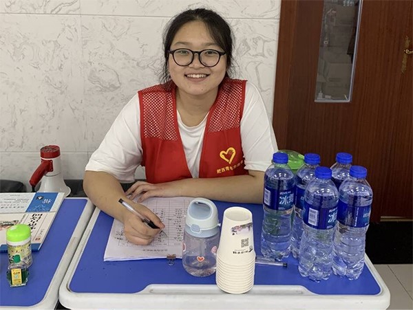 胡婷婷,2017级高职2班学生。在收到当地志愿者招募通知后,她立即报名加入其中,前往肥西县铭传高级中学帮助分发赈灾物资,登记居民所需,为居民供应饭菜等生活必需品。