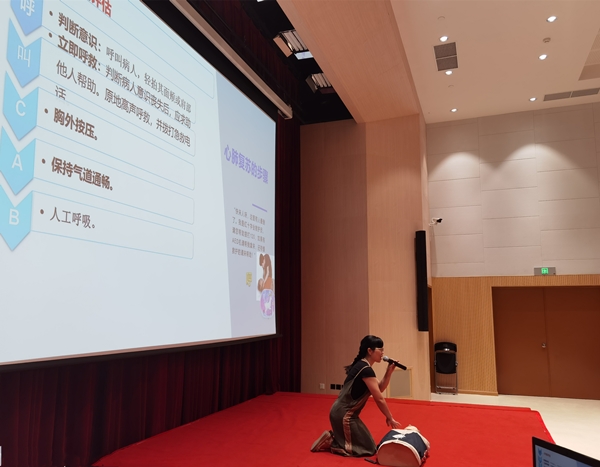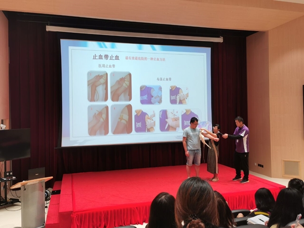 应急救护知识培训分为理论教学和实践操作两个部分。理论教学部分培训老师主要以生动的实例讲授了救护概念、创伤救护、意外伤害现场救护、心肺复苏等知识,并向学员们演示了三角巾绷带包扎法、人工呼吸法、心肺复苏术等应急救护技术。