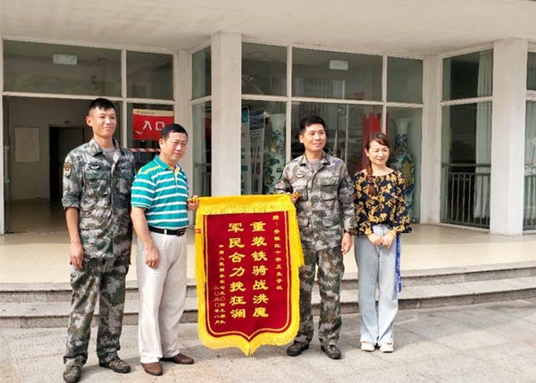 8月21日下午,临时驻扎在我校的中国人民解放军73049部队将一面写有“重装铁骑战洪魔,军民合力挽狂澜"的锦旗送给学校,感谢学校对部队防汛抗洪工作的大力支持,校党总支书记方劲松、校长洪梅代表学校接收赠旗。