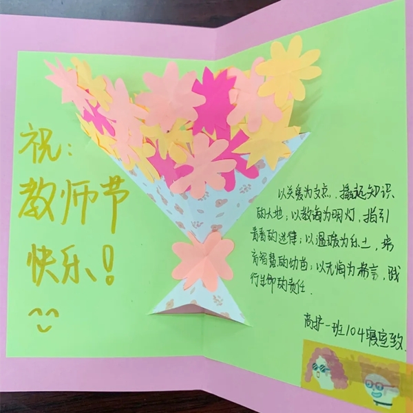 小小祝福送给您。今天 “感谢师恩”又一次在学校中成为主旋律。学生自制贺卡、卡片,给老师写祝福短语,虽然每幅画的内容和祝福不同,但学生们发自内心的祝福让老师们甜透心田。