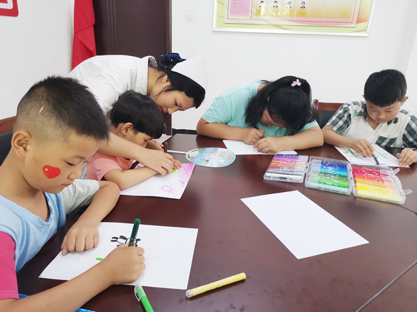 美育班由志愿服务队指导教师汪双春主讲,当地暑期在家的儿童基本都参加了美育班。红会卫校志愿服务队为孩子们提供了画笔、画纸等材料,手把手教学,为孩子们普及绘画基本知识,引导孩子们树立艺术思维,培养兴趣,不断激发孩子们的艺术才能。