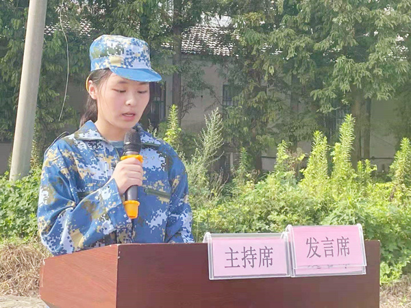 2021级高职影像班学生李嘉雯作为新生代表进行发言,表示将一切行动听指挥,严格要求自己,遵守各项纪律,端正态度,保持良好的内务秩序。教官代表在发言中强调了军训的意义,希望通过本次军训在每一位同学的血液中注入爱国基因,培养学生的爱国情怀,不管加强对学生的爱国主义教育。