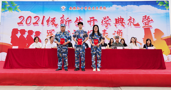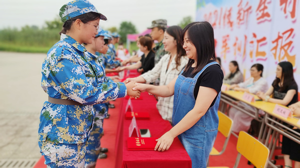 学生处主任朱丽敏宣读了关于军训期间优秀个人的表彰名单。2021级中护13班王雪柔同学代表全体新生进行发言,她希望同学们精神严格要求自己、激励自己,不断砥砺品格、提升自我,用求知的艰辛和积累的快乐填充生命的颜色、放飞青春的梦想,争取早日成为一名优秀的医护工作者。