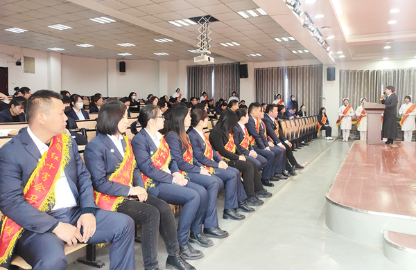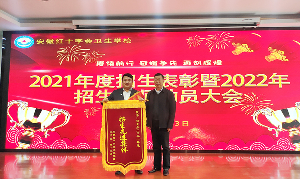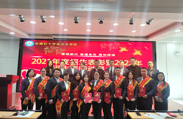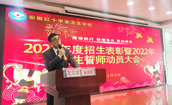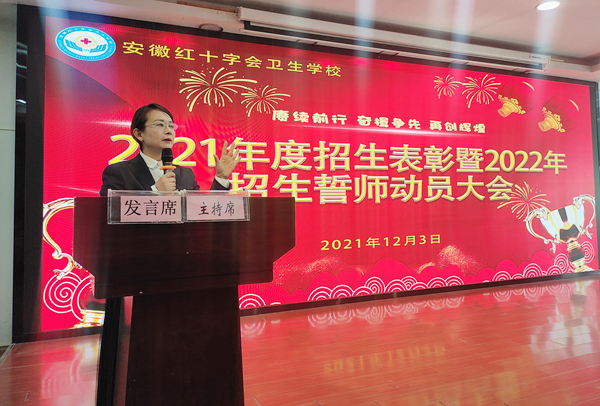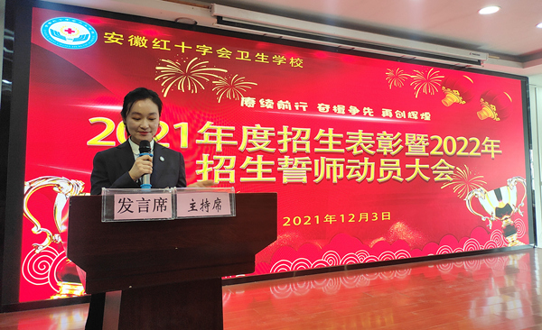 伴随着冬日的那一缕缕阳光,让整个红会卫校的校园在阳光的照耀下显得各位的温暖与惬意。带着这份冬日的专属温馨,12月3日中午,在做好各项防疫工作的前提下,红会卫校在教学楼一楼多功能厅隆重举行2022年招生动员大会暨2021年度招生表彰工作大会,校党总支书记方劲松、校长洪梅、副校长胡军健出席大会,全体教职工参加大会,会议由招生办公室负责人司蓉主持。