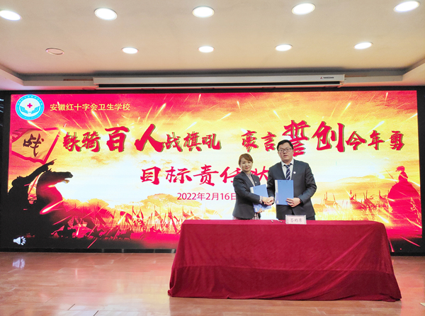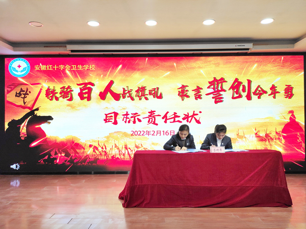 在催人奋进的背景音乐中,学校各职能部门负责人依次上台与学校签订2022年工作目标责任状;学校各年级班主任代表依次上台与学生处签订班主任目标责任状。