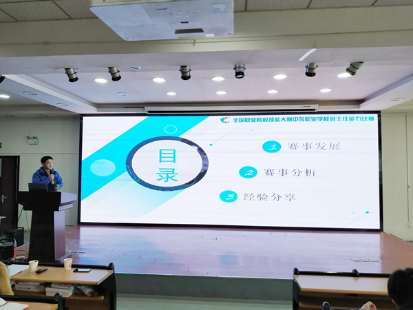 班主任技能专题培训中,钟成浩老师对中职院校班主任能力大赛进行宏观分析,并结合自身参赛经验,对比赛要求进行讲解,指出在参赛材料准备过程中,应该重点留意的地方,以及容易被忽视的地方。王惠老师带着她的国赛获奖作品给全体老师现场模拟参赛时的场景,并通过实际案例讲解情景模拟环节注意事项。